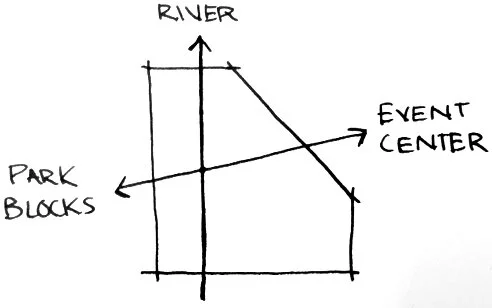 Other site elements include a public plaza, housing, retail, and a rooftop event space. The site is currently undeveloped but will include a waterfront park with a hotel and continuous bike trails. (Team effort to build site model)